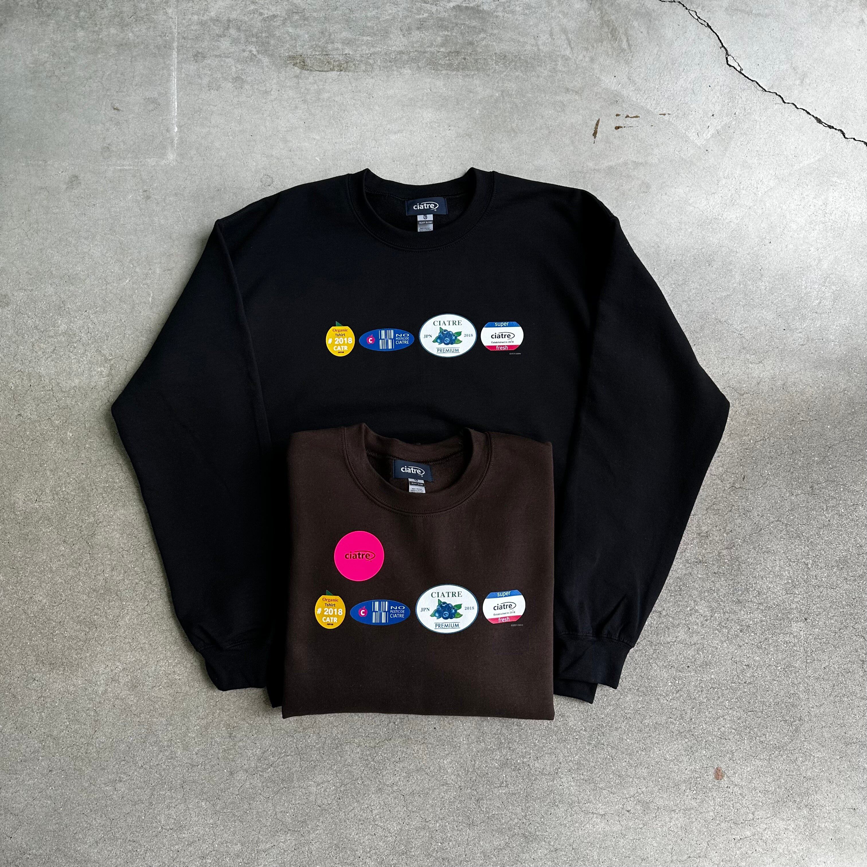 様々なラベルがプリントされたスウェットシャツ。